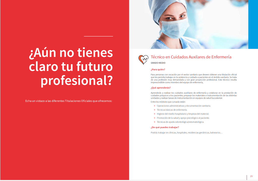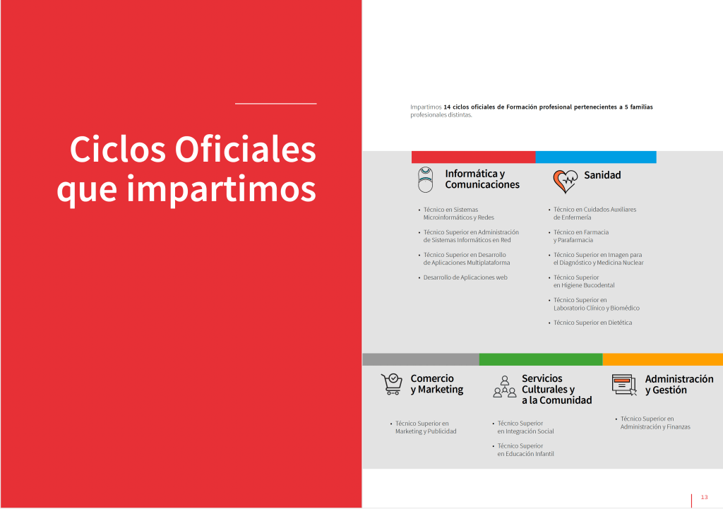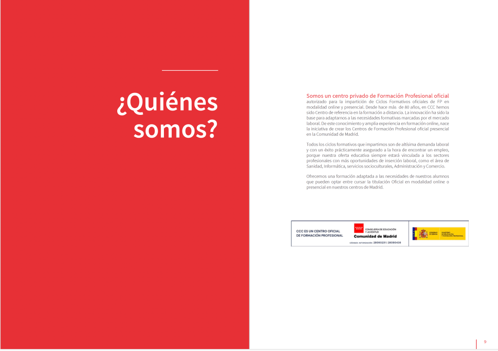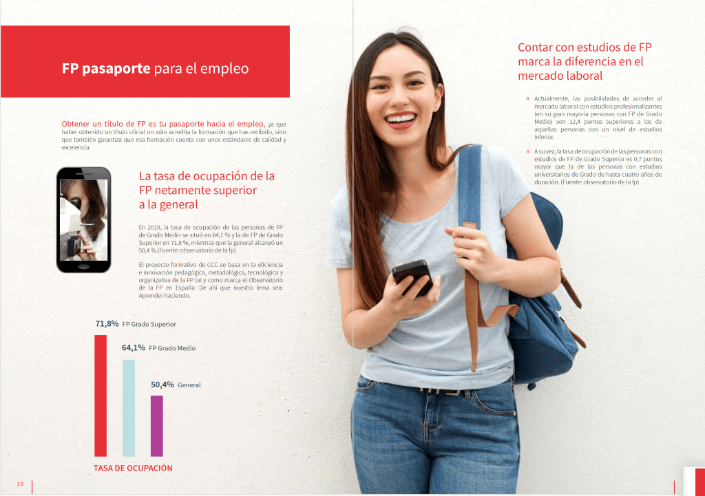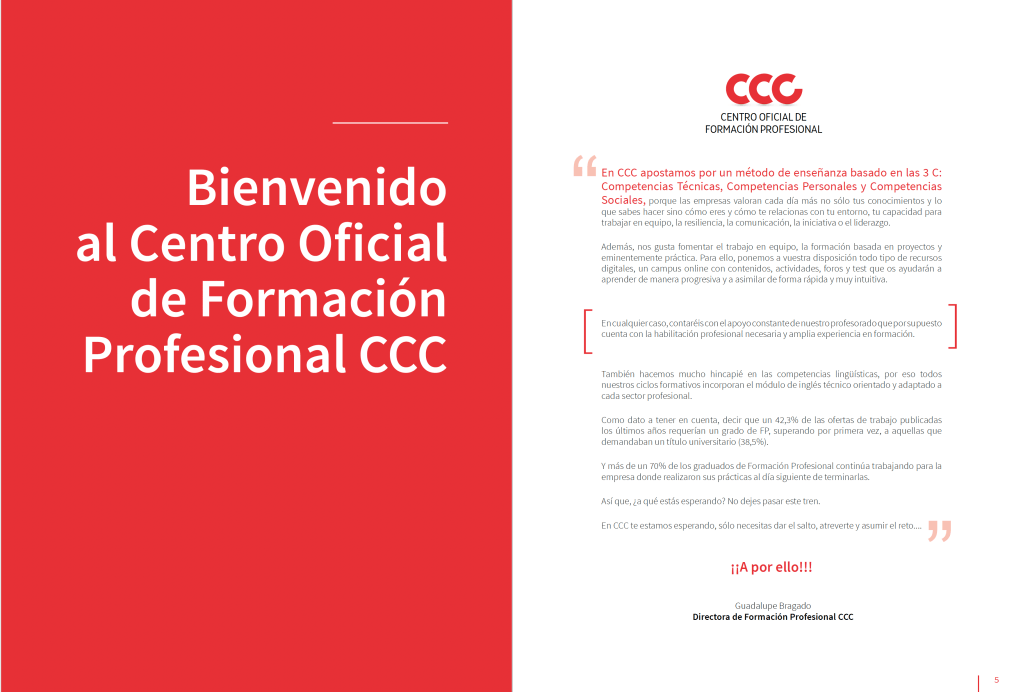 El objetivo de esta guía para los estudiantes de Formación Profesional de CCC fue crear un diseño claro, visual y atractivo. Quería que fuera fácil de entender y que explicara de forma sencilla todos los detalles importantes de la formación, facilitando el aprendizaje de los estudiantes.
